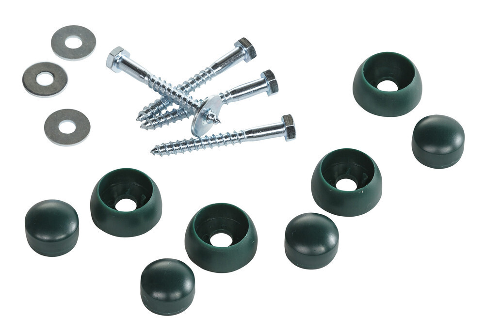 Bevestigingsset voor groene duikelstang. 4 x schroef (DIN571 ø8) en sluitring. 4 x groene afdekdoppen.