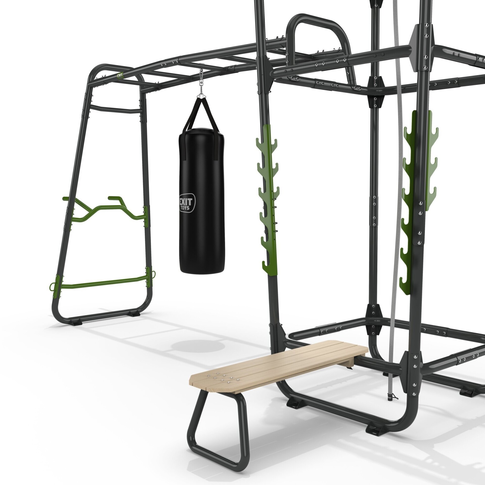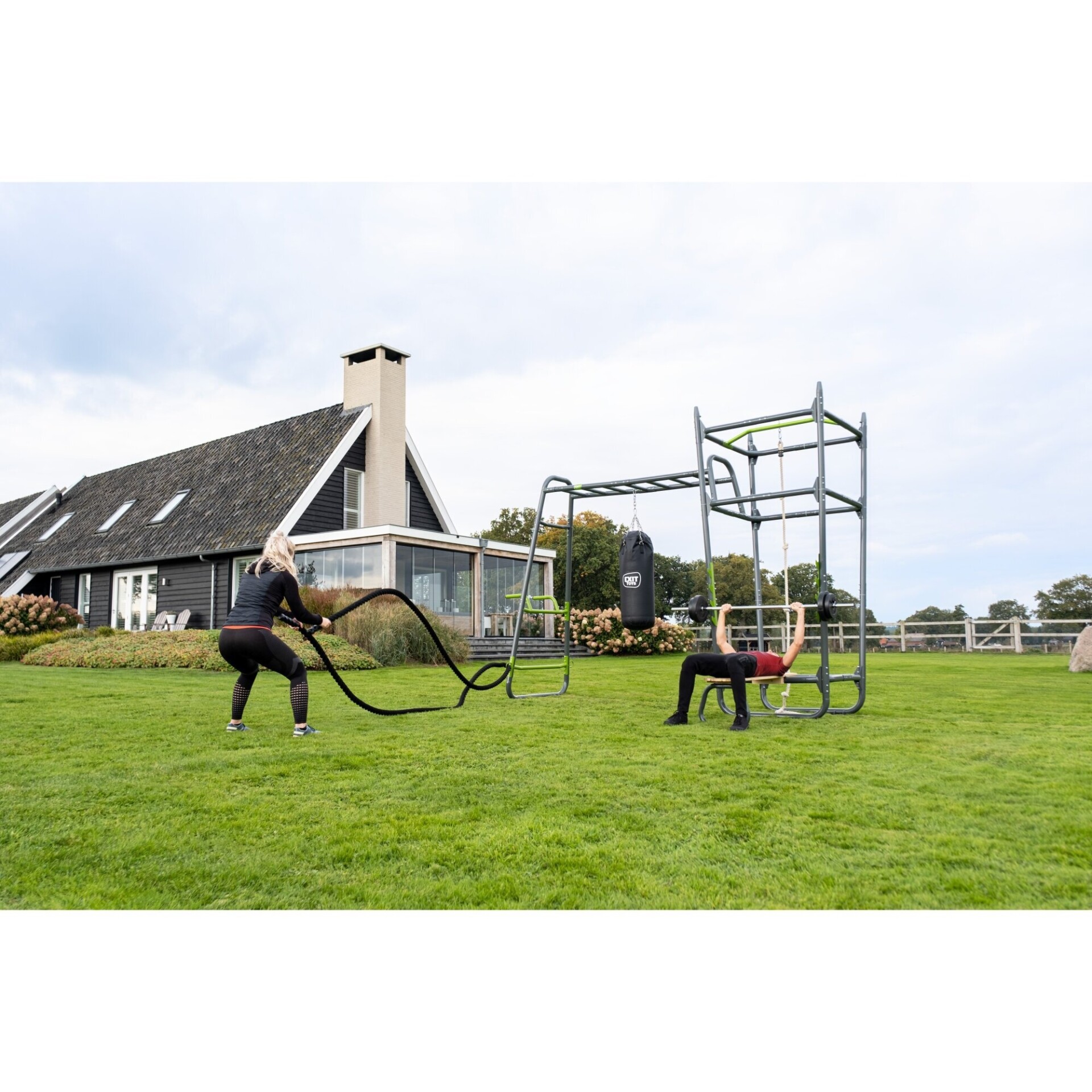 De EXIT GetSet PS510 is een fitnessrek van ruim vier meter voor buiten. De volgende accessoires zijn inbegrepen: push-up stang, dip station, battle rope ringen, bokszak, fitnessbank, haltersteunen, pull-up stang en klimtouw. Deze powerstation is multifunctioneel en biedt volop uitdaging voor sportieve 14-plussers en volwassenen. Haal de sportschool naar jouw huis met de GetSet PS510!