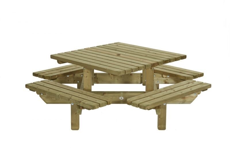 Robuust uitgevoerde vierkante picknicktafel. Door de open ruimte tussen de zittingen een ideale instap. Geschikt voor intensief gebruik, zowel thuis als in horeca/recreatie. Stevige vierkante picknicktafel. Volledig in Nederland geproduceerd, met extra aandacht voor kwaliteit in hout en afwerking. Deze picknicktafel heeft een ideale vrije instap door de ruimte tussen de zittingen. Alle gezaagde uiteinden van het hout zijn geschuurd. Deze bewerking zorgt voor een perfect afgewerkte picknicktafel die rondom splintervrij is. Alle onderdelen worden vanaf de onderzijde geschroefd, daardoor zijn er geen schroeven zichtbaar in tafelblad en zitting. Ook krijgt de picknicktafel daardoor een langere levensduur, er zijn namelijk geen schroefgaten aan de bovenzijde van het hout waar vocht in kan blijven staan. Elk onderdeel is per stuk, onder druk geïmpregneerd. Door deze verduurzamingsmethode krijgt het hout een langere levensduur en treedt er minder snel vergrijzing op. De houtsoort is Noord-Europees vurenhout, dit is hout met een rustige nervenstructuur en kleine vastzittende noesten. Tijdens het afmonteren van de picknicktafel wordt de mooiste kant van het hout naar de bovenkant gemonteerd. De picknicktafel heeft een opening (50mm) midden in het tafelblad om een parasol in te plaatsen. De hoge houtkwaliteit in combinatie met een perfecte afwerking zorgen voor een schitterend product. Een uitermate geschikte picknicktafel voor zowel particulier als professioneel gebruik. Geen montage nodig, wordt standaard compleet gemonteerd aangeleverd.