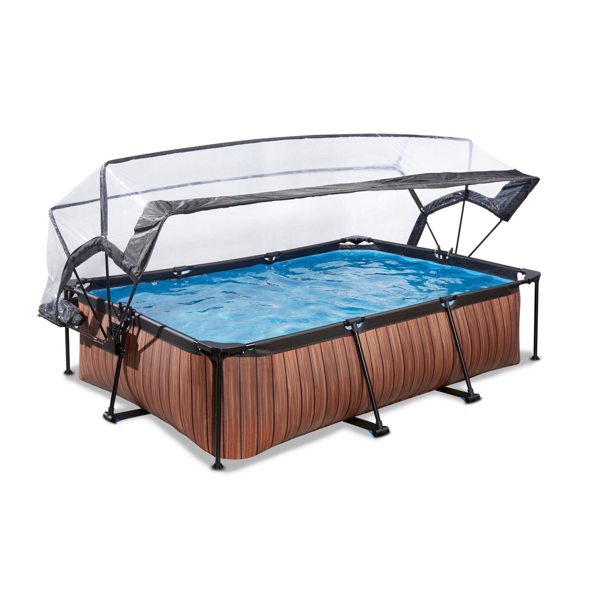 Het EXIT Wood zwembad 300 x 200 x 65 cm is een rechthoekig frame zwembad met overkapping. Dit compacte zwembad met houtlook is standaard voorzien van een filterpomp en valt op tussen andere baden door zijn stoere houtpatroon. Ben je op zoek naar een geschikt zwembad voor jonge kinderen of een ondiep bad om zelf lekker in af te koelen? Kies dan voor dit unieke en hoogwaardige frame zwembad met overkapping van EXIT Toys!