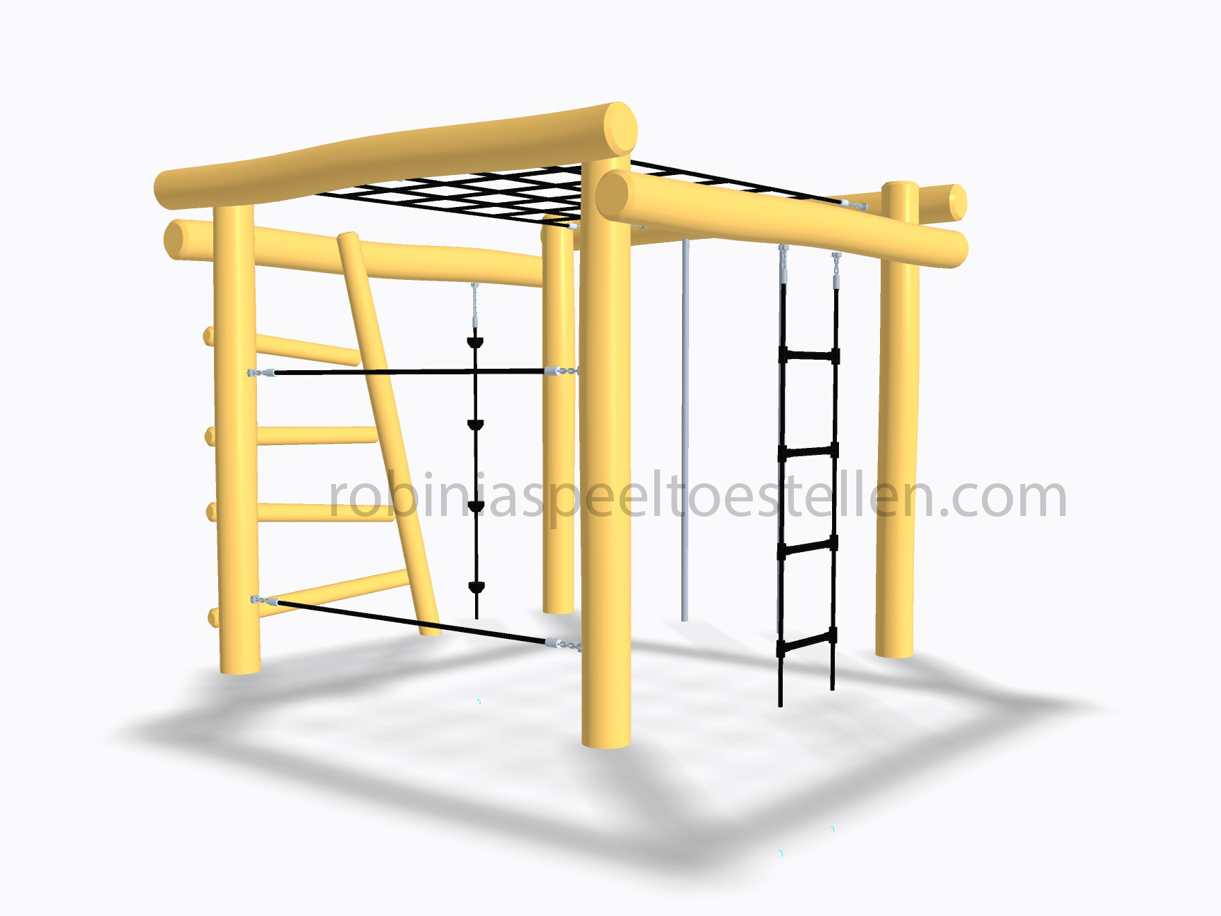 – Klimtoestel met 2 klimstangen, net bovenin, touwladder, knopentouw, verticale touwen en klauterbalken