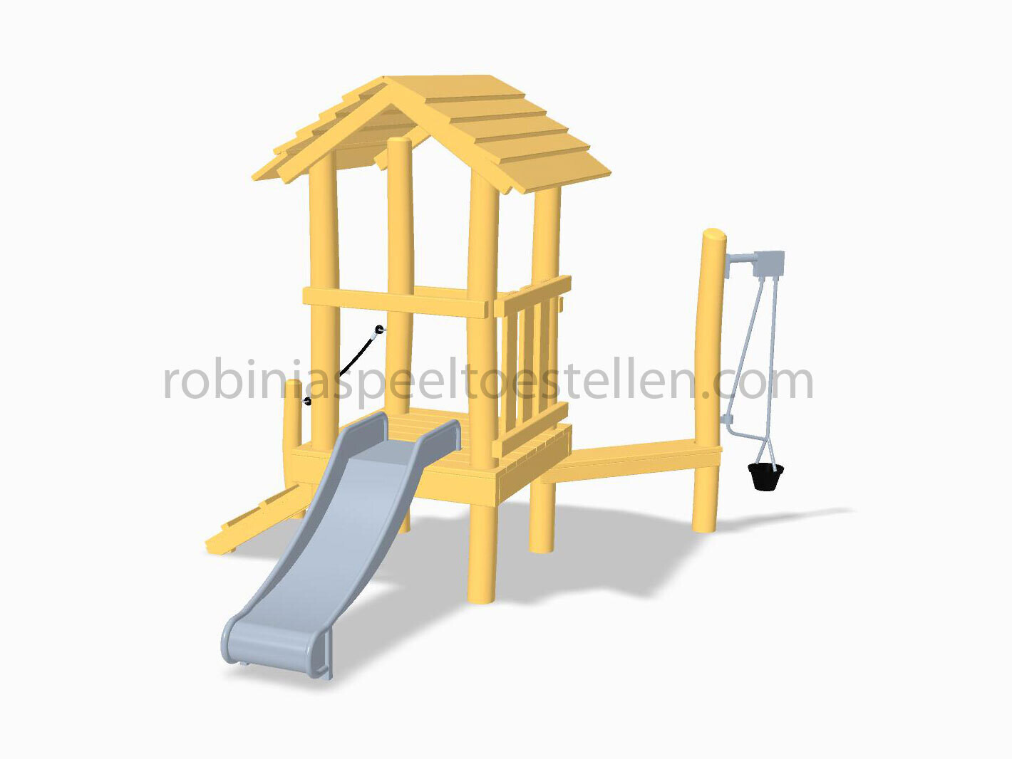 wordt bijna compeet gemonteerd geleverd, m.u.v. glijbaan en klimwand