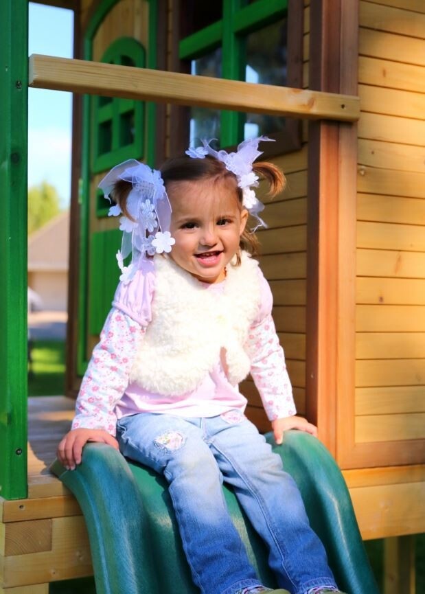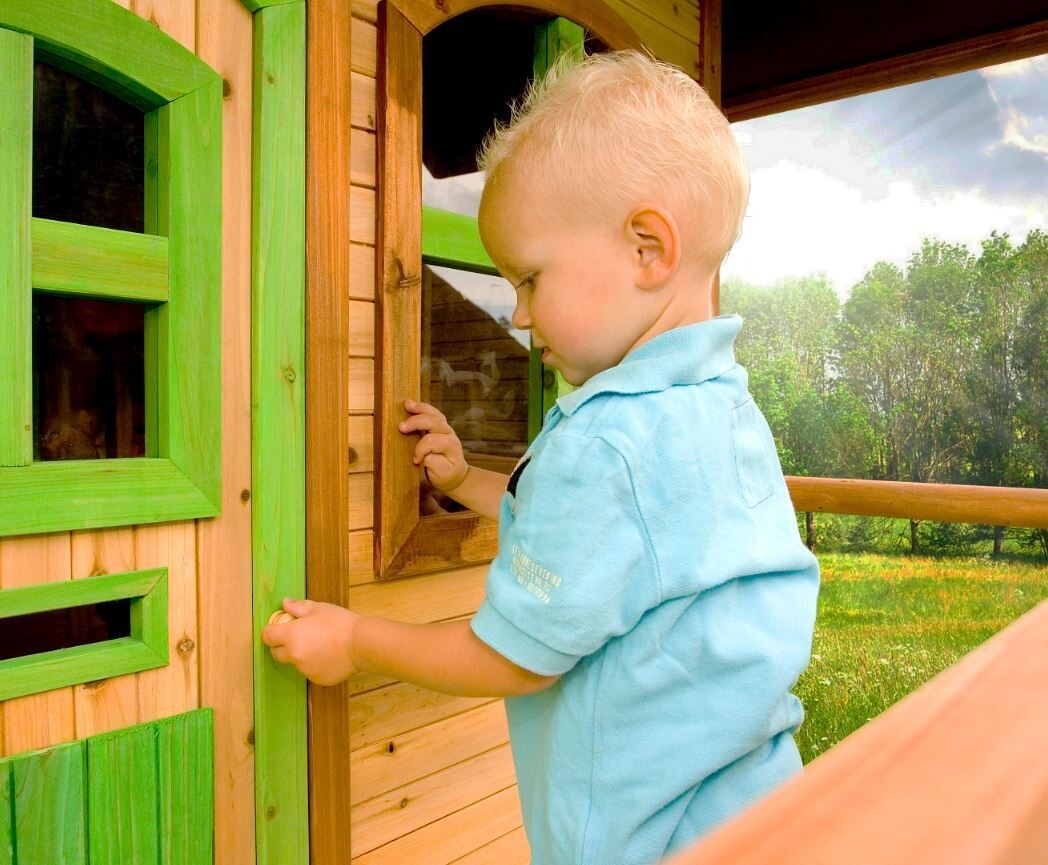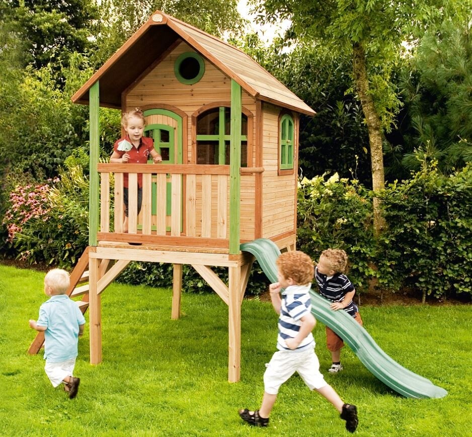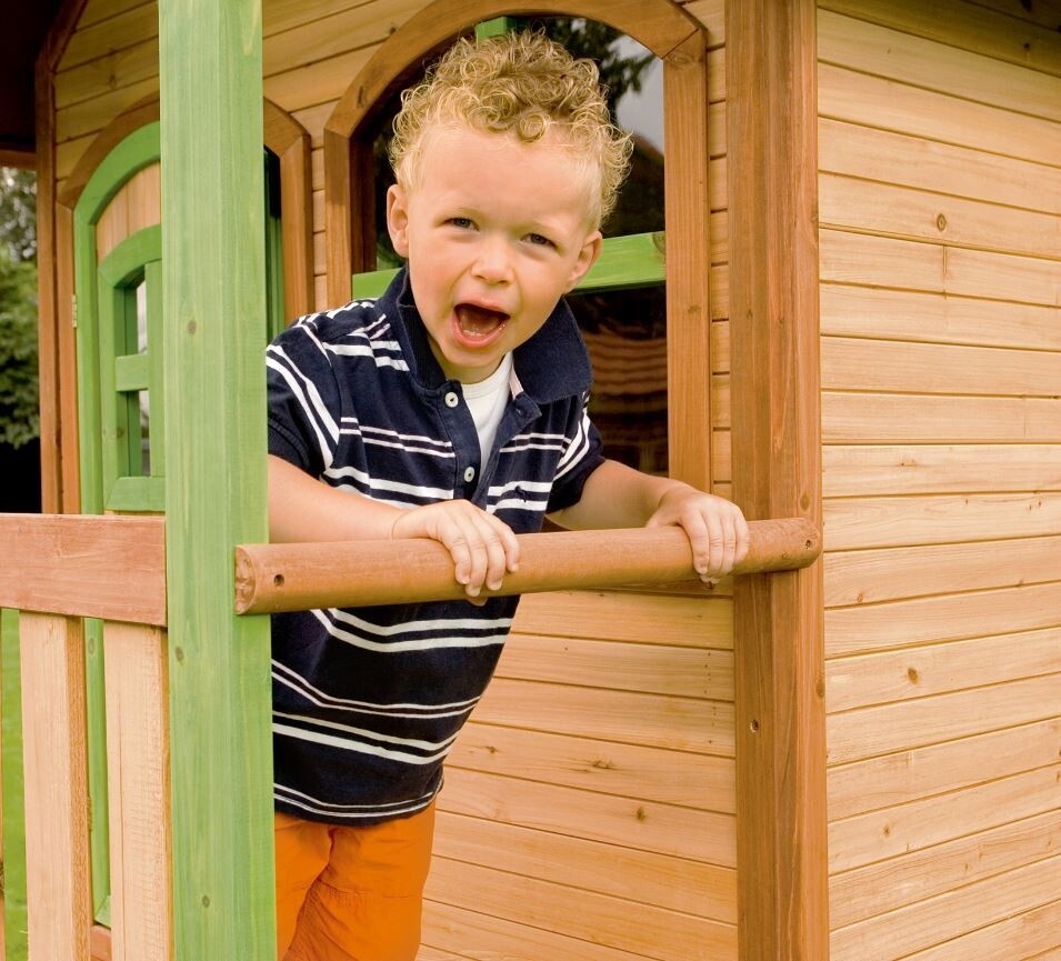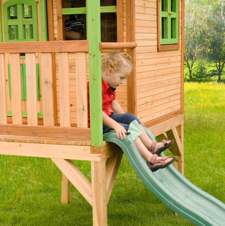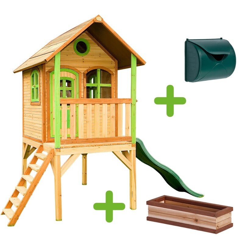 Speelhuis Lara staat op hoge palen, heeft een veranda, trappetje en lange glijbaan. Ronde voordeur en ramen die open en dicht kunnen. Cederhouten planken: 15 mm. Framewerk: 38 mm. 100 % FSC hout.