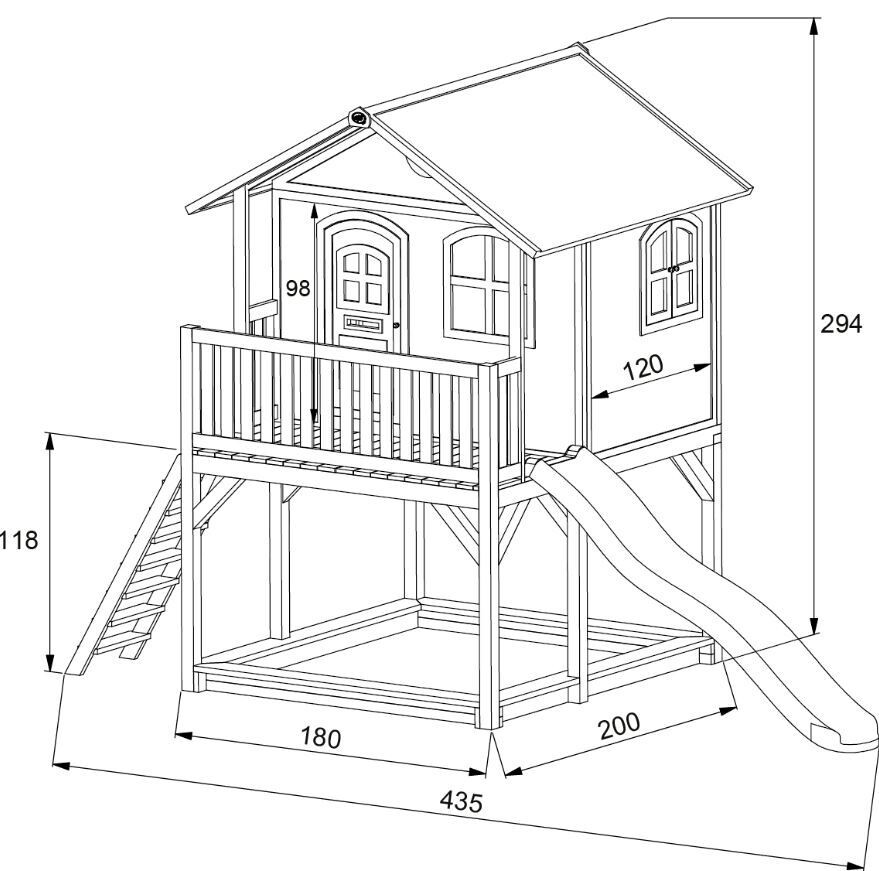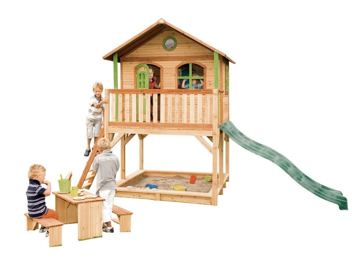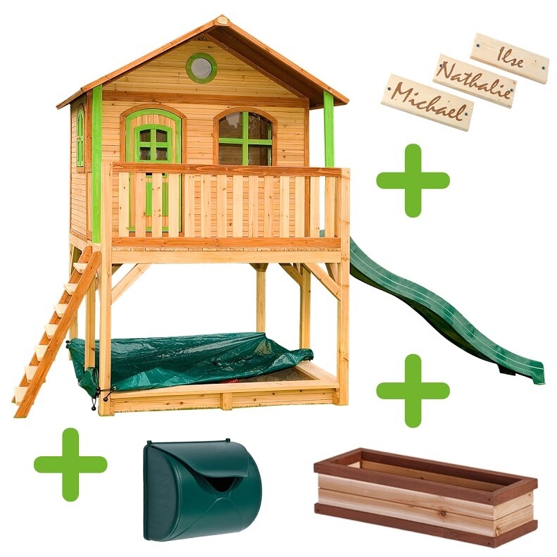 Marc is een groot (Milan) speelhuis op een hoge opbouw en brede glijbaan en is een van de grootste speelhuizen van hout die je ooit hebt gezien! Als je wilt, kun je hier zelfs in blijven slapen... Zo kun je samen met je vrienden een pyamafeestje houden in je eigen speelhuis! En overdag kun je natuurlijk samen glijden, klimmen en een fort van zand bouwen in de zandbak onder het huis. Vergeet dan 's nachts niet de zandbakhoes over de zandbak te doen, zodat de kat van de buren jullie fort niet kan veroveren. \n \nDe glijbaan is mogelijk in de volgende kleuren: blauw, paars, rood, grijs, appelgroen en donkergroen. Graag aangeven in de opmerkingen bij het betalen welke kleur glijbaan u wilt. \n \nWanneer u kiest voor een appelgroene, blauwe, paarse of rode glijbaan, wordt het huisje geleverd in de kleur: bruin/wit (zie laatste foto). \n \nHet speelhuis wordt geleverd inclusief afdekzeil voor de zandbak!