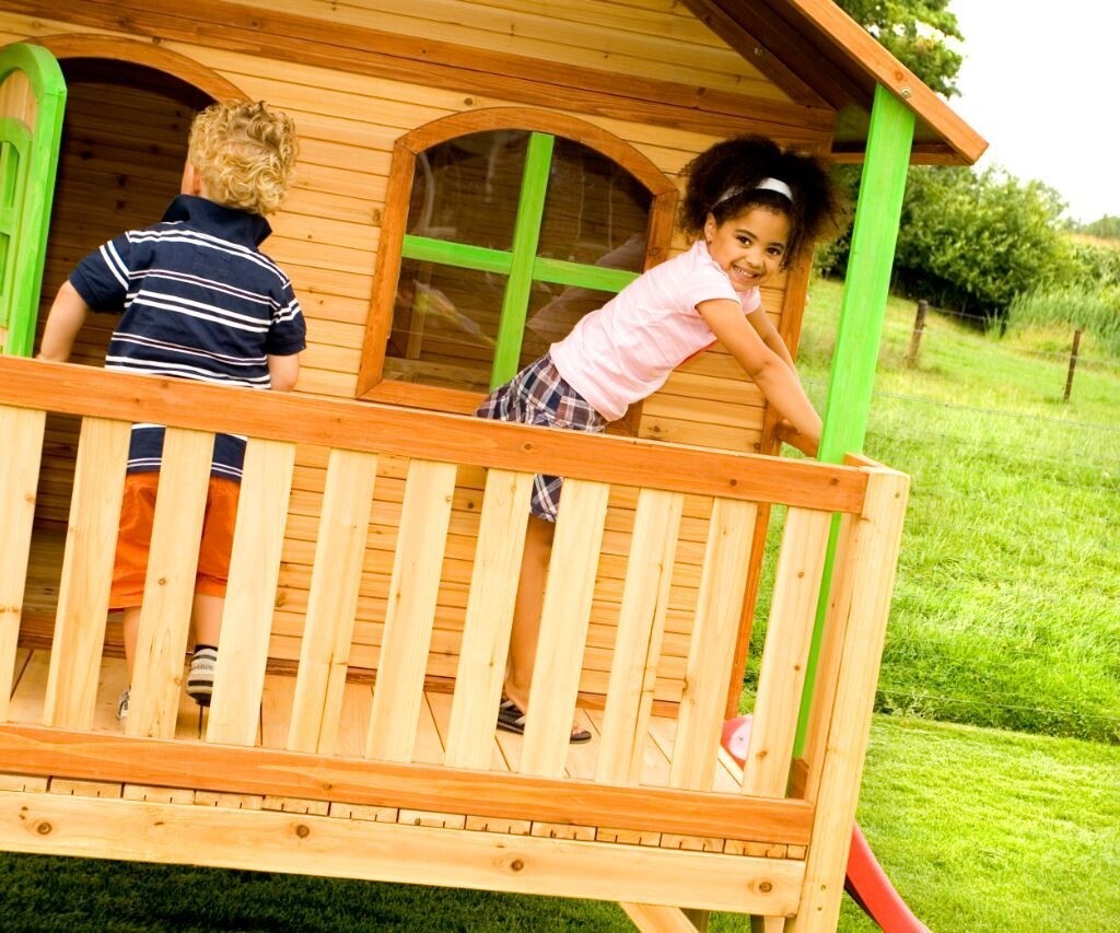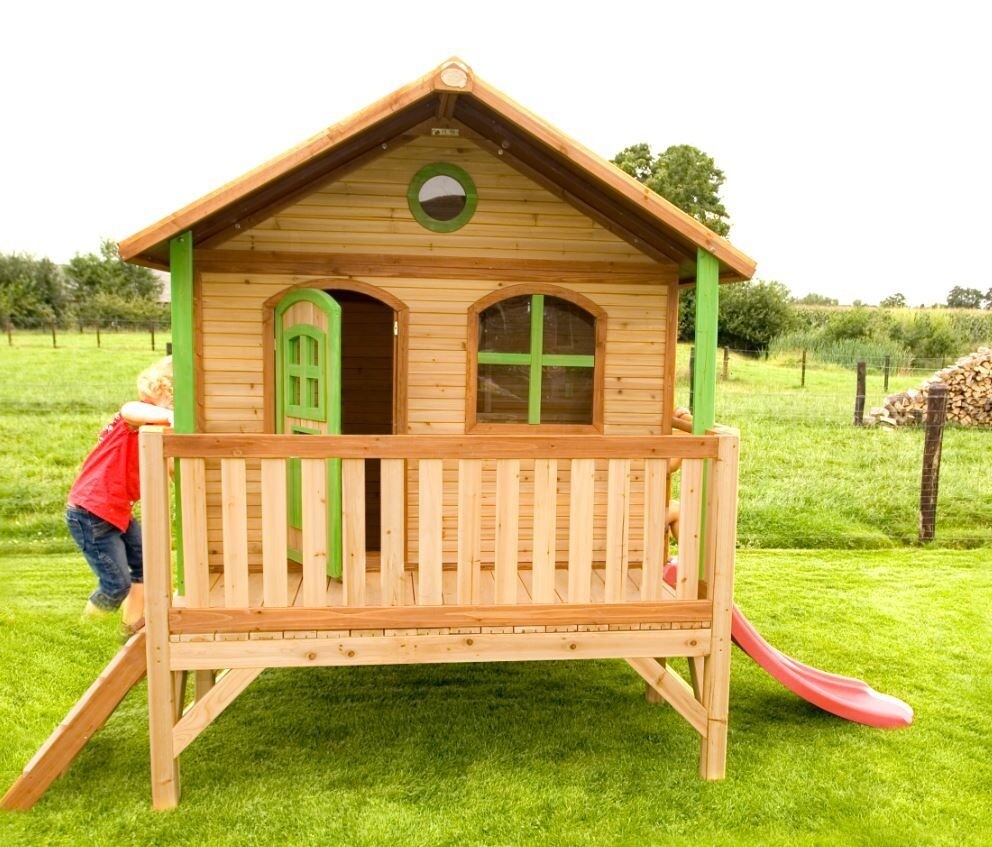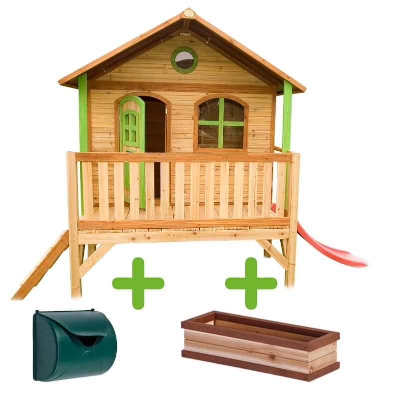 Speelhuis Stef is een groot speelhuis op poten met aan de ene zijde een trap en aan de andere zijde een glijbaan. Halfronde voordeur en ramen die open en dicht kunnen. Cederhouten planken: 15 mm. Framewerk: 38 mm. 100 % FSC hout.