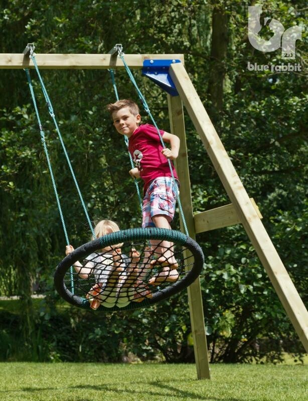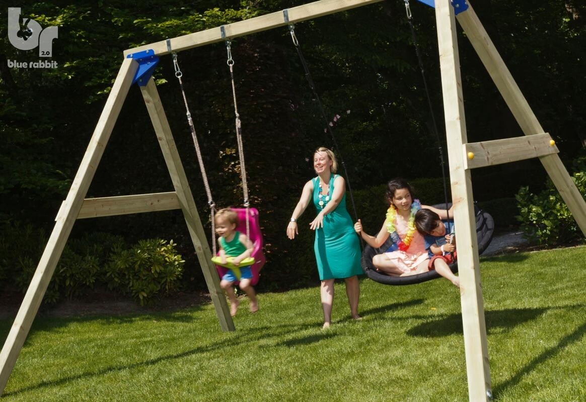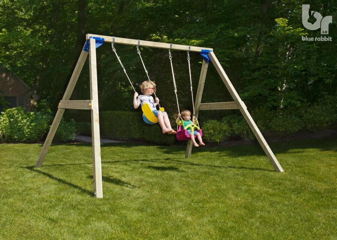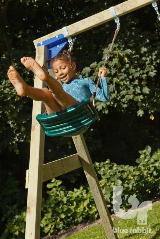 Met deze schommelconstructie kun je echt alle kanten op. Kies uit de vele beschikbare schommelzitjes, trapezes, ringen om aan deze schommelconstructie te bevestigen. Of begin met een babyzitje en groei met je kind mee door er later een ander zitje aan te bevestigen. De constructie wordt standaard zonder zitje geleverd.