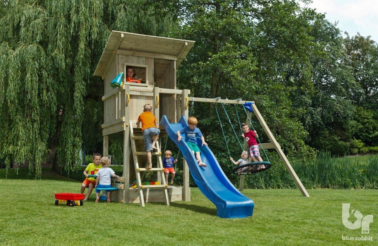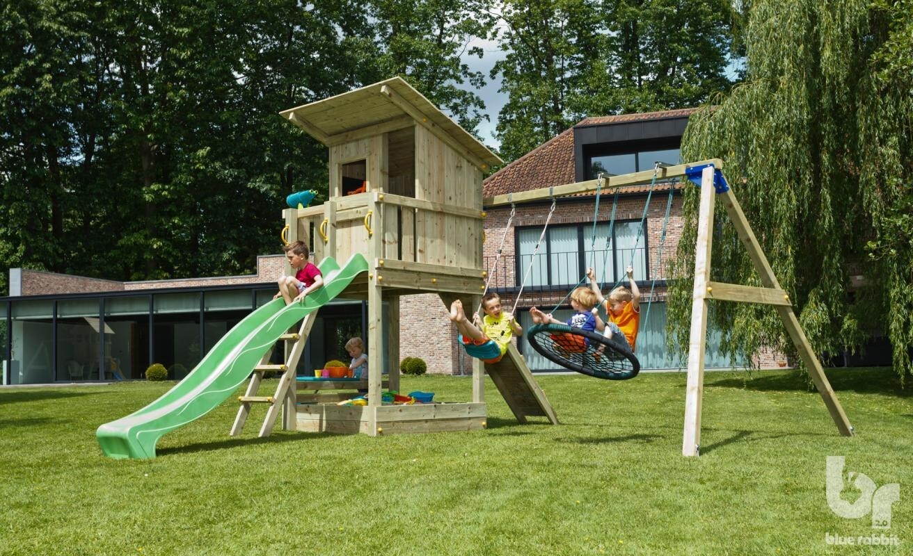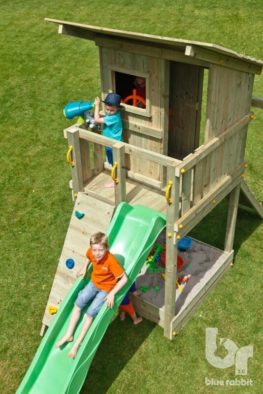 Speelhuis met heel eigen uitstraling. Inclusief balkon aan het huisje om de omgeving te verkennen. Onder het huisje zit een zandbak. Aan de voorzijde van het huis is een extra opening waar eenvoudig een extra aanbouwelement aan bevestigd kan worden.
