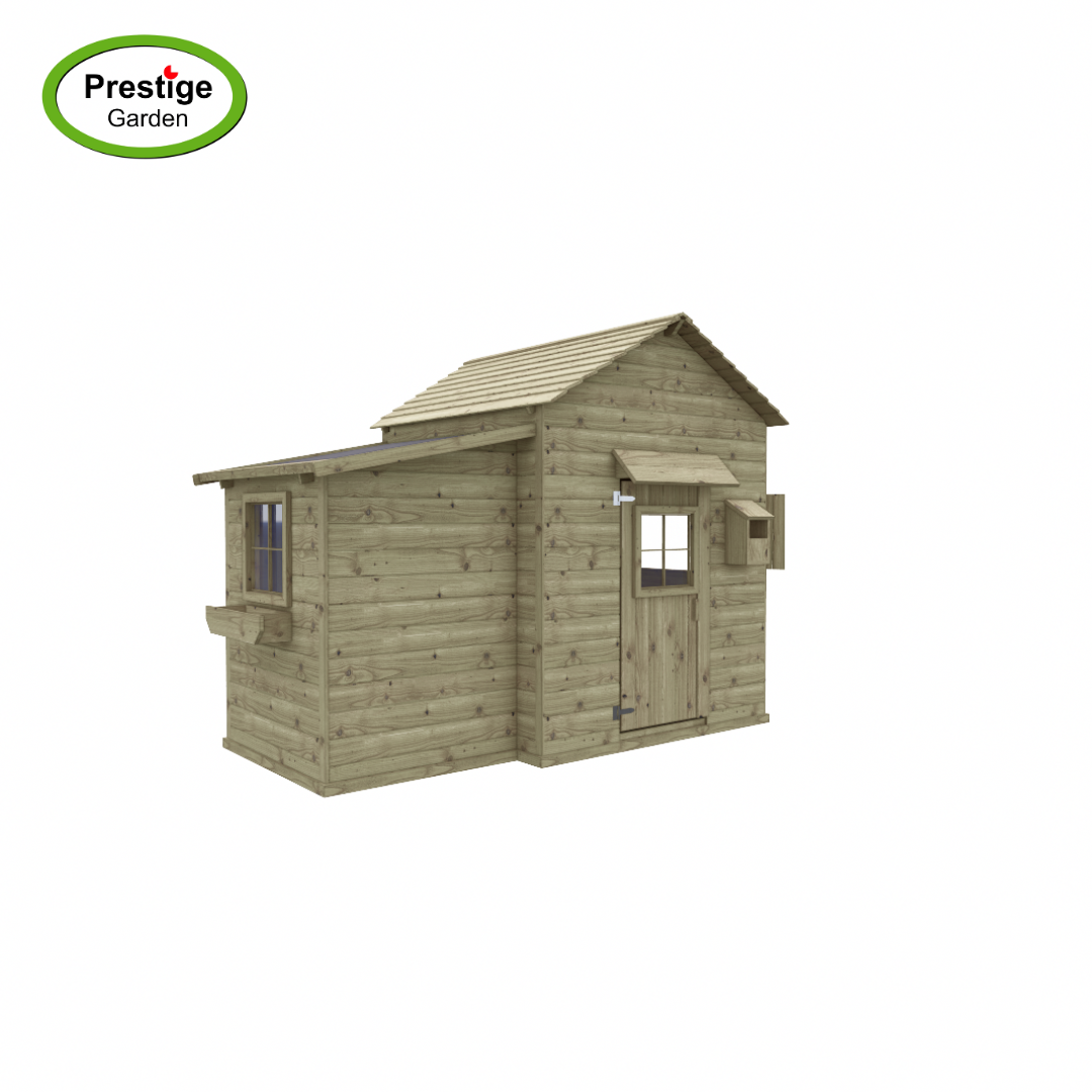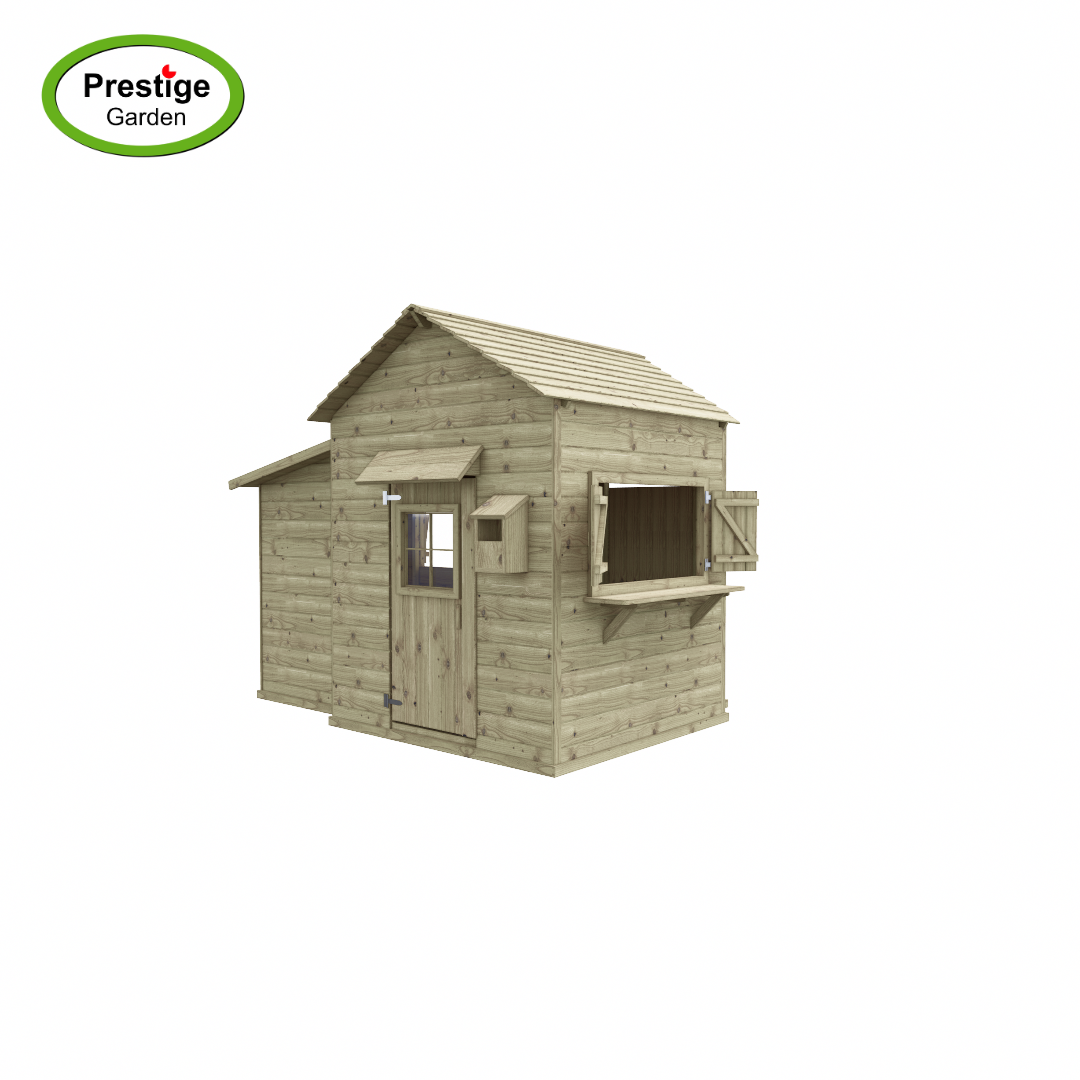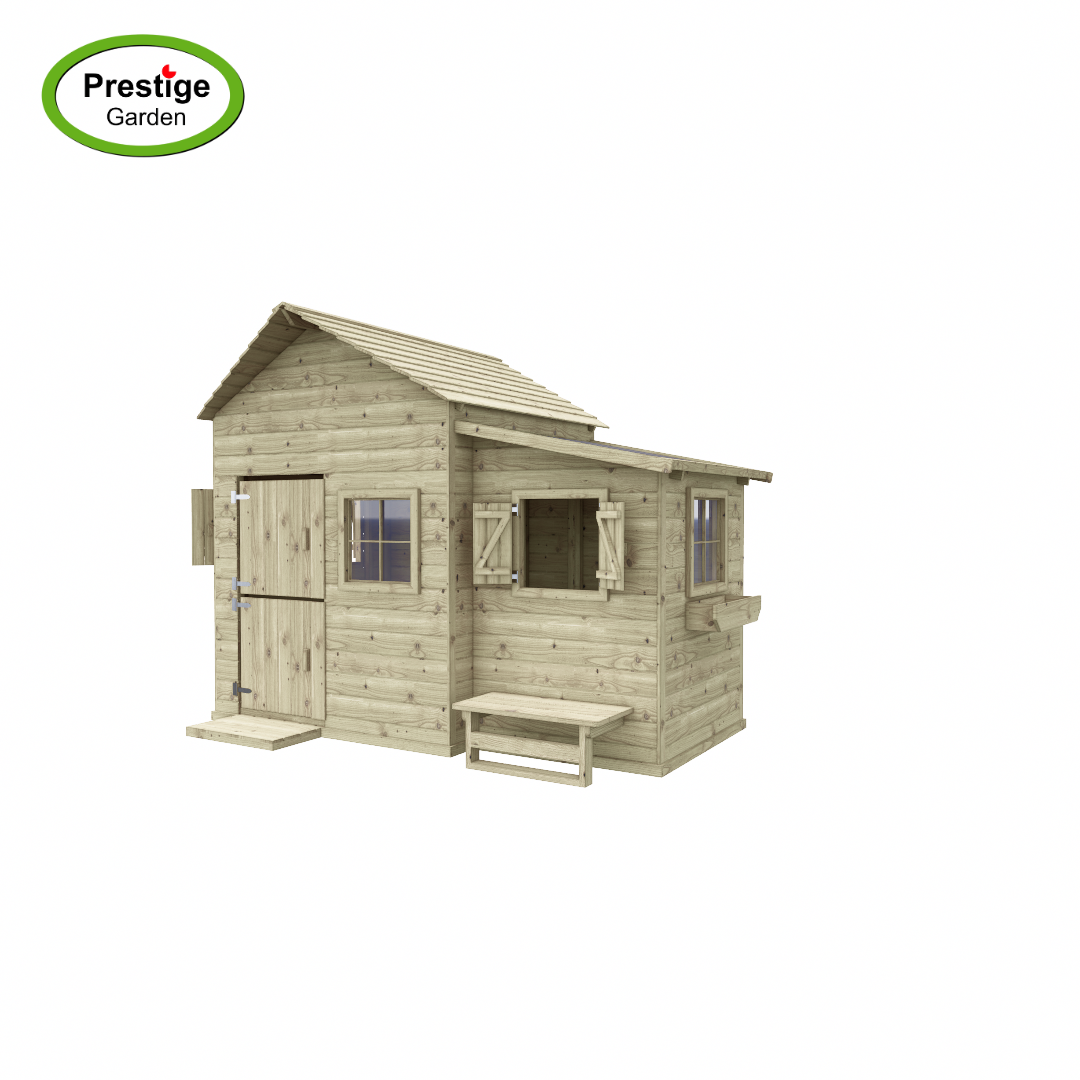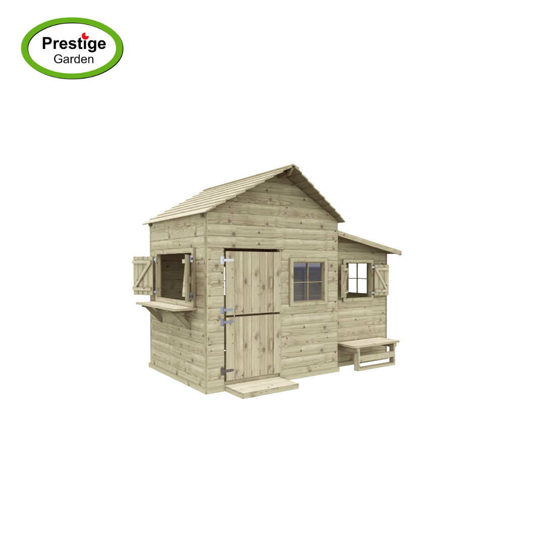 Op zoek naar een houten speelhuisje met sfeer? Dan is houten speelhuisje Butterfly het perfecte huisje. Het houten speelhuisje bestaat uit een basishuisje met daaraan een aanbouw. De karakteristieke details geven het huisje een lieflijke uitstraling. Rondom is het speelhuisje voorzien van veel raampjes en zelfs 2 deuren. Het houten speelhuisje is geïmpregneerd en vrij eenvoudig in elkaar te zetten. De dikte van het hout is 12 mm. Het basishuisje heeft een gepotdekseld dak, de aanbouw heeft dakleer.