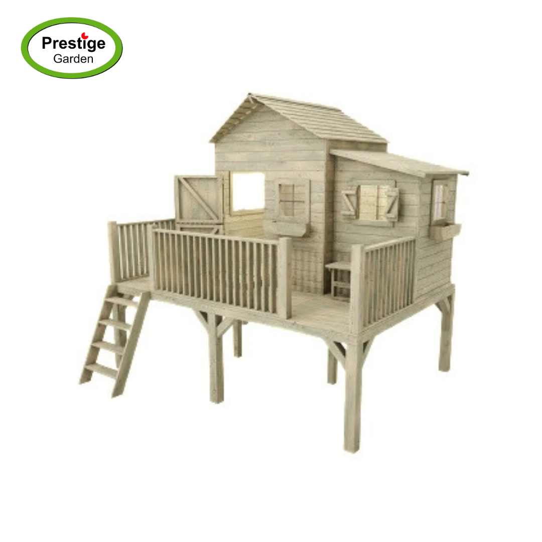 Op zoek naar een houten speelhuisje met sfeer? Dan is houten speelhuisje Butterfly het perfecte huisje. Het houten speelhuisje bestaat uit een basishuisje met daaraan een aanbouw. De karakteristieke details geven het huisje een lieflijke uitstraling. Rondom is het speelhuisje voorzien van veel raampjes en zelfs 2 deuren. Het houten speelhuisje is geïmpregneerd en vrij eenvoudig in elkaar te zetten. De dikte van het hout is 12 mm. Het basishuisje heeft een gepotdekseld dak, de aanbouw heeft dakleer.