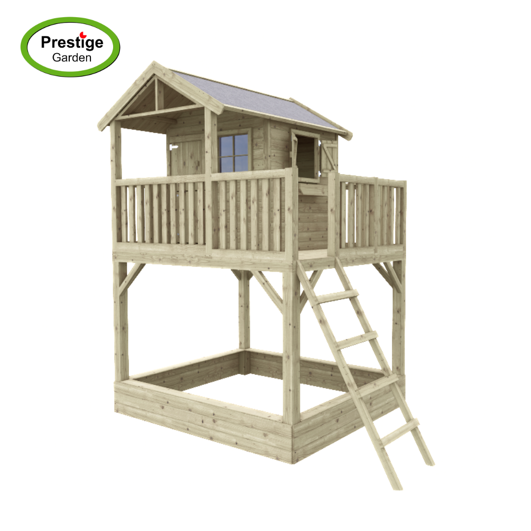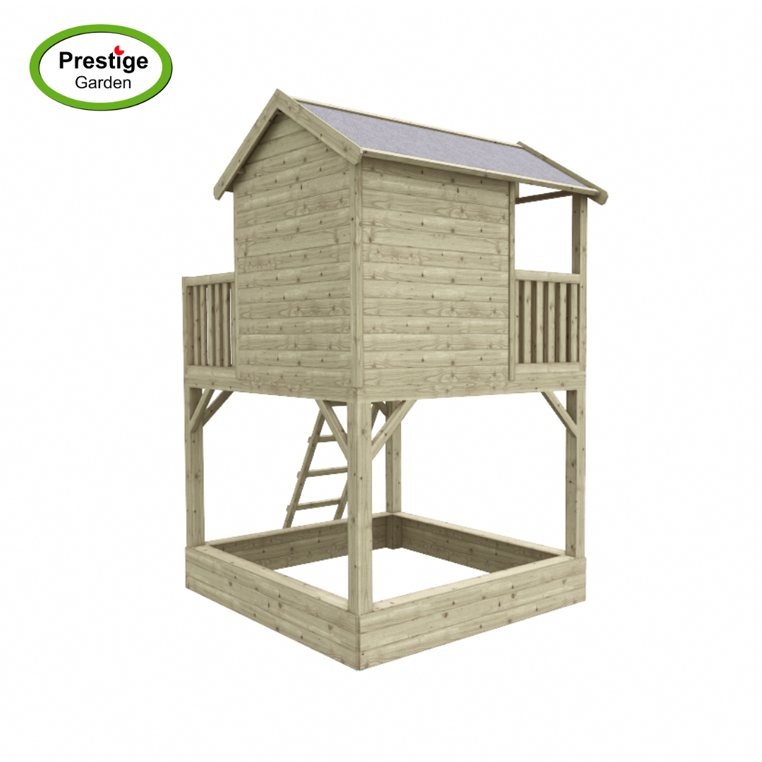 Aan de voorzijde is de paalwoning voorzien van een vast kunststof glasraam en in de zijgevel een raamuitsparing met luiken en een bloembak. Het raam en de tweedelige deur zijn voorzien van vingerklembeveiliging. Inclusief zandbak.