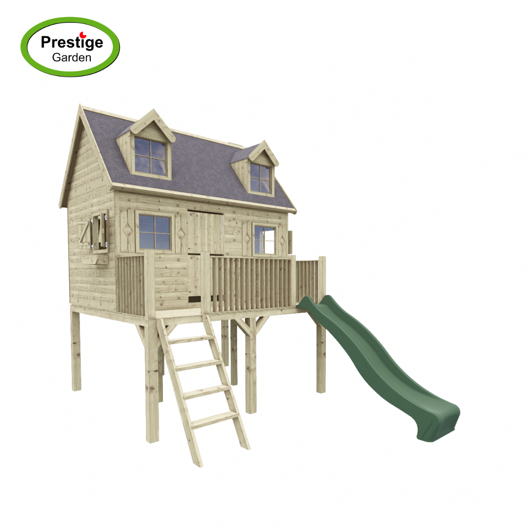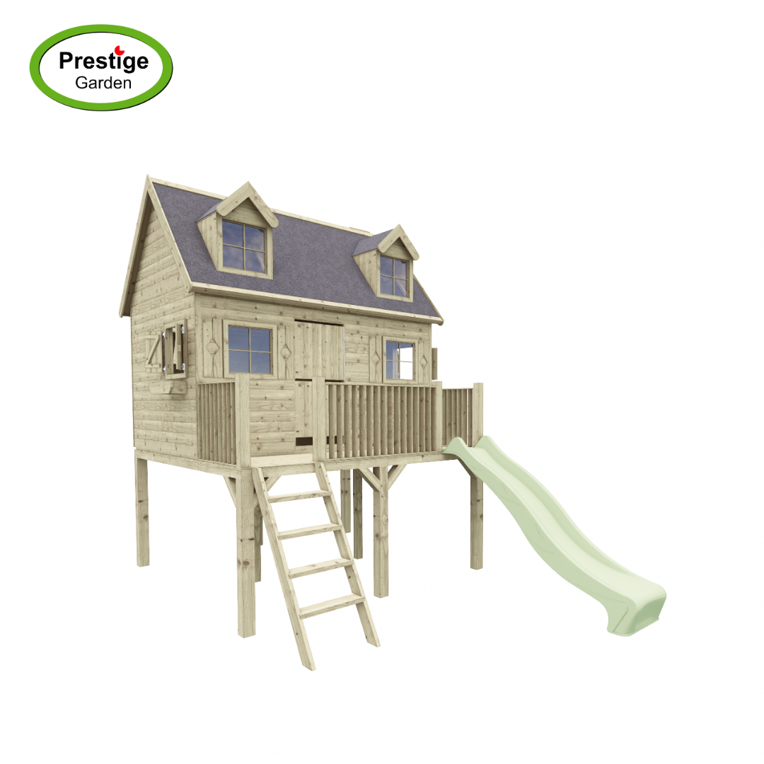 Op zoek naar een prachtig speelhuis voor uw kind? Dit speelhuisje is ontworpen met een ruimtelijk design. Het speelhuis is gemaakt van geïmpregneerd grenen hout. Het puntdakje zorgt voor een natuurlijke uitstraling en maakt van dit speelhuisje bijna een woonhuisje! Wat dit huis nog leuker maakt is dat er zelfs een zolder inzit met dakkapellen!