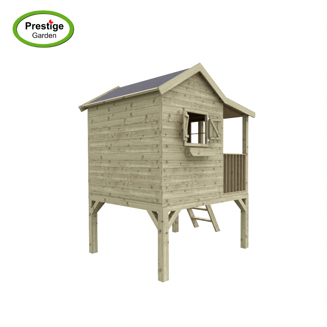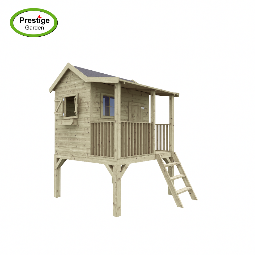 Dit speelhuis met zijn tweedelige deur biedt uw kinderen unieke ervaringen binnen hun eigen vier muren. Het huiselijke karakter wordt gecompleteerd door de veranda, de luiken en de bloembakken.