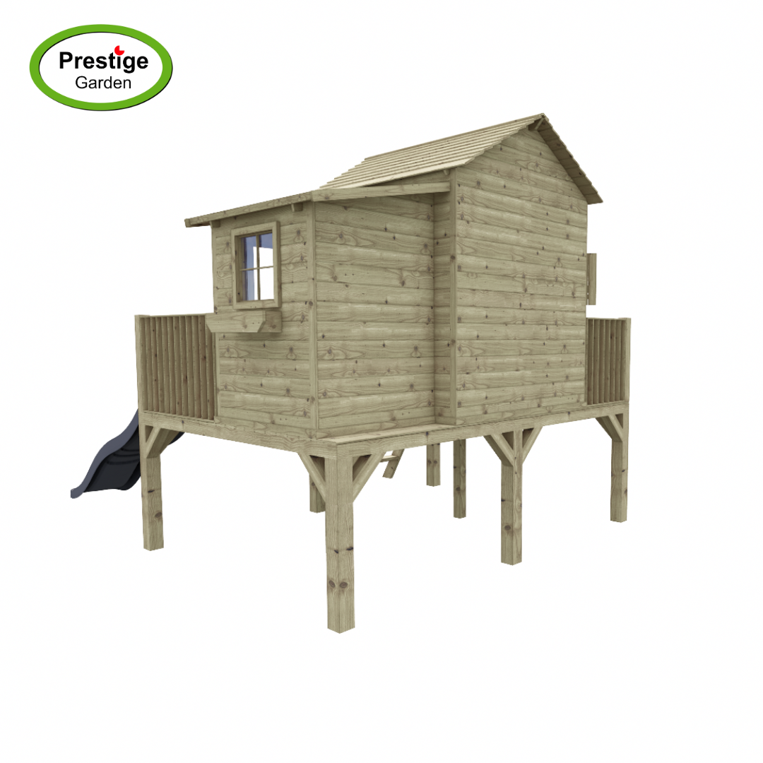 Het houten speelhuisje is geïmpregneerd en vrij eenvoudig in elkaar te zetten.