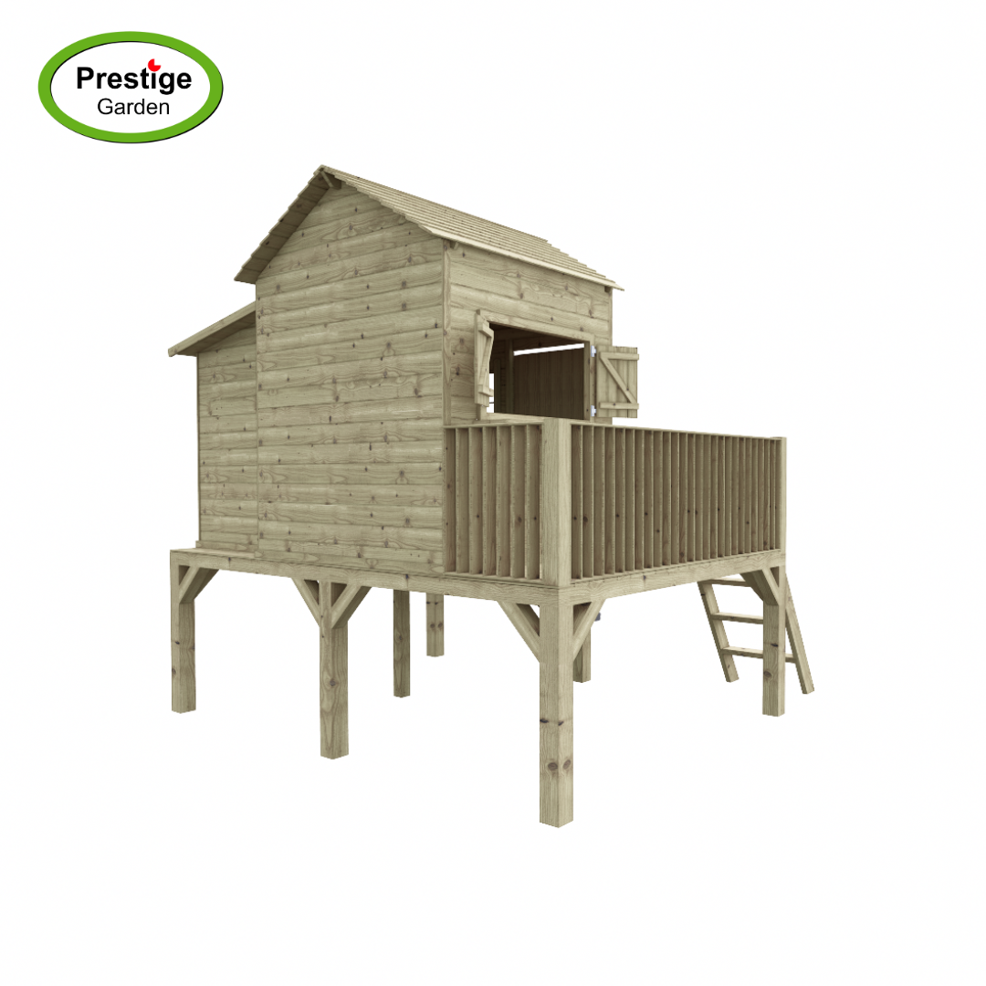 Het houten speelhuisje bestaat uit een basishuisje met daaraan een aanbouw.
