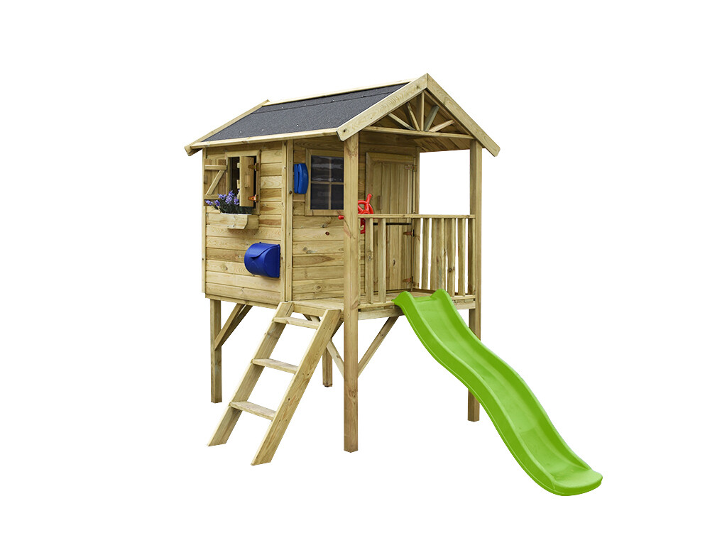 Houten speelhuis Funny XL met diverse leuke items er op en er aan. Ook leuk uit te breiden met de accessoires!