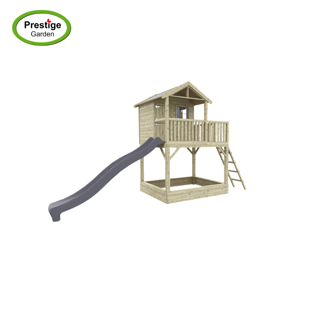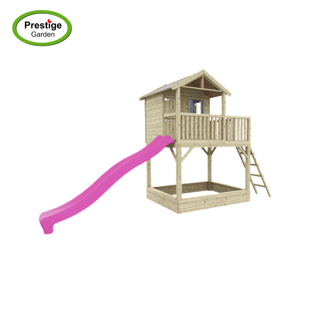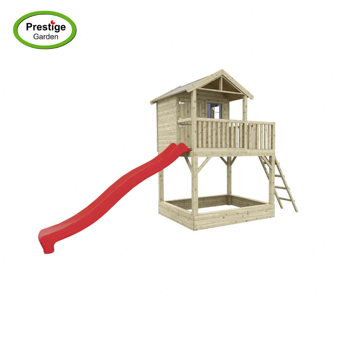 Dit mooie speelhuis wordt nu tijdelijk met gratis glijbaan geleverd! Keuze uit 300cm of 240cm. Vermeld bij het bestellen in de opmerkingen de glijbaan keuze.
