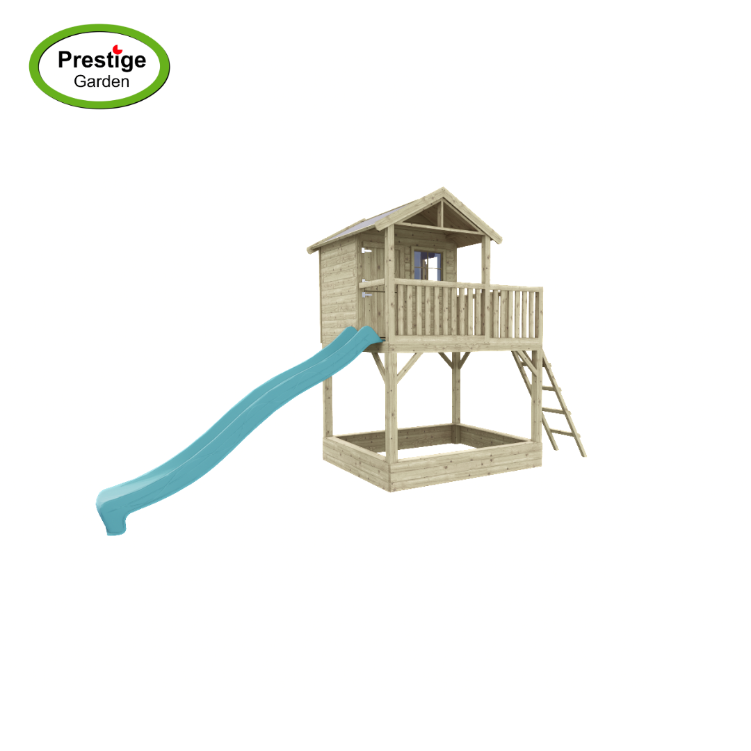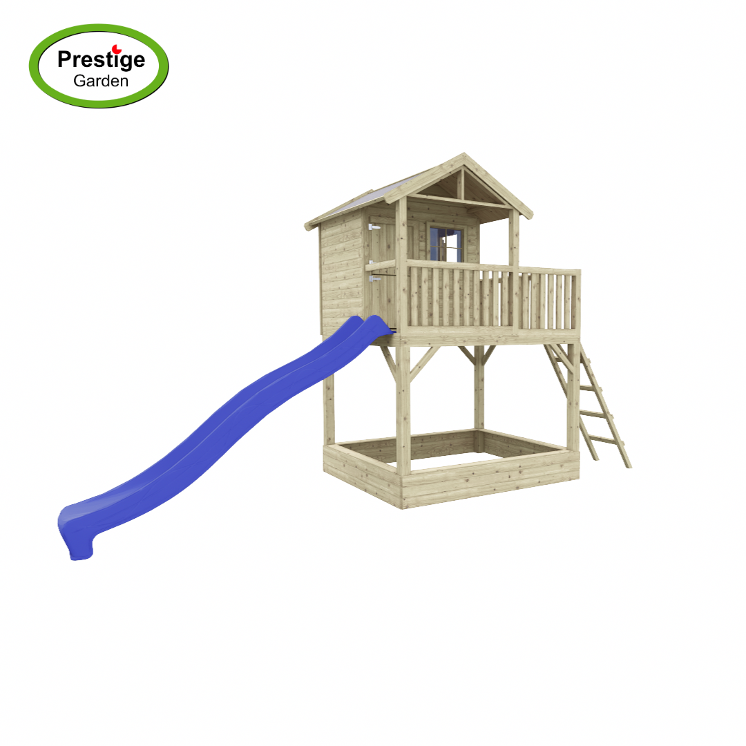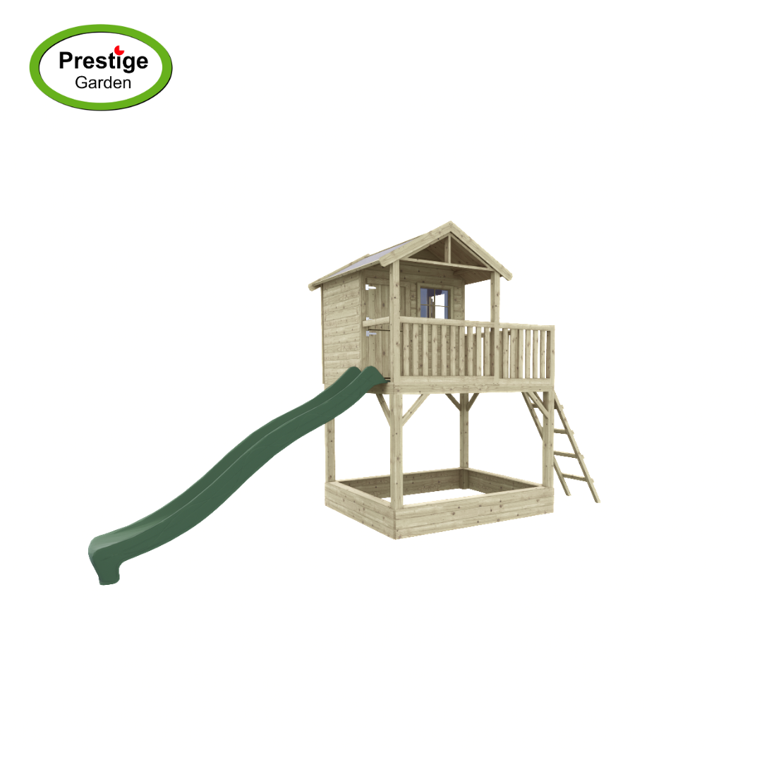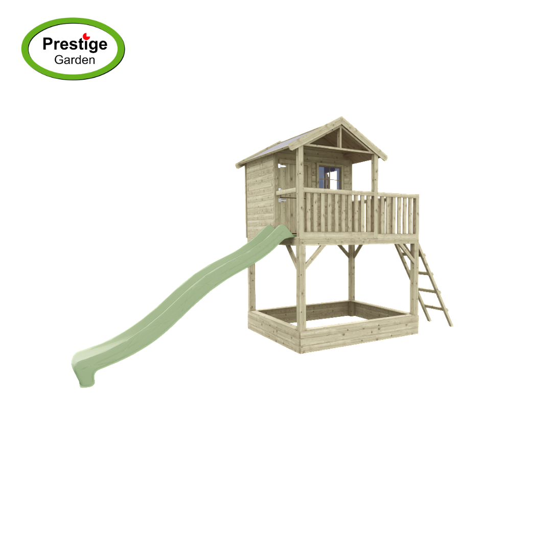 Dit mooie speelhuis wordt nu tijdelijk met gratis glijbaan geleverd! Keuze uit 300cm of 240cm. Vermeld bij het bestellen in de opmerkingen de glijbaan keuze.