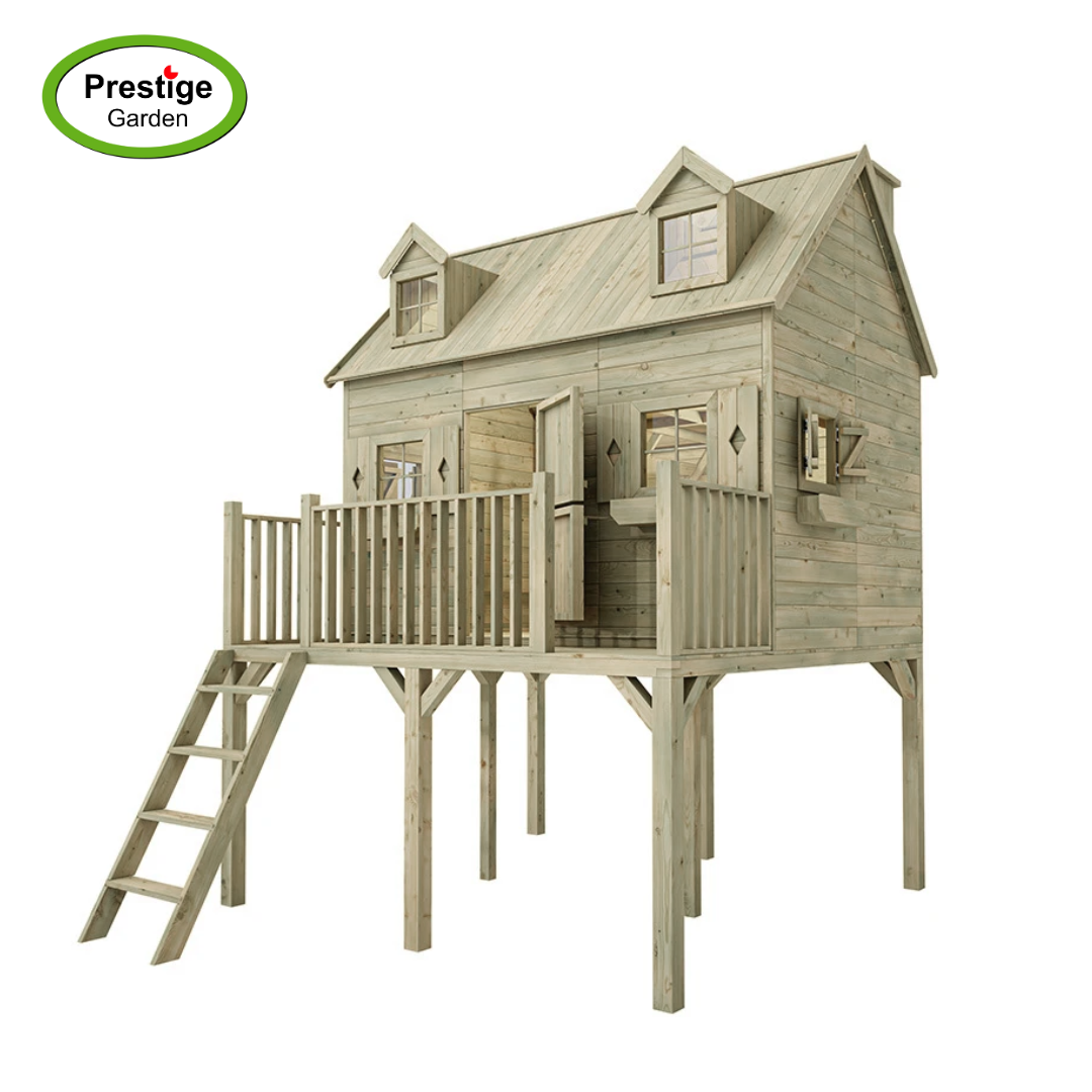 Dit speelhuisje is ontworpen met een ruimtelijk design. Het speelhuis is gemaakt van geïmpregneerd grenen hout.