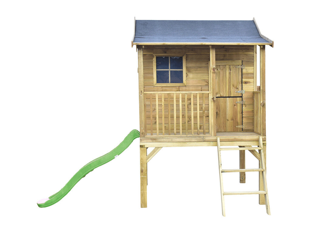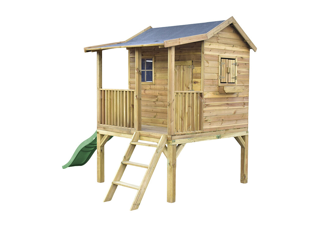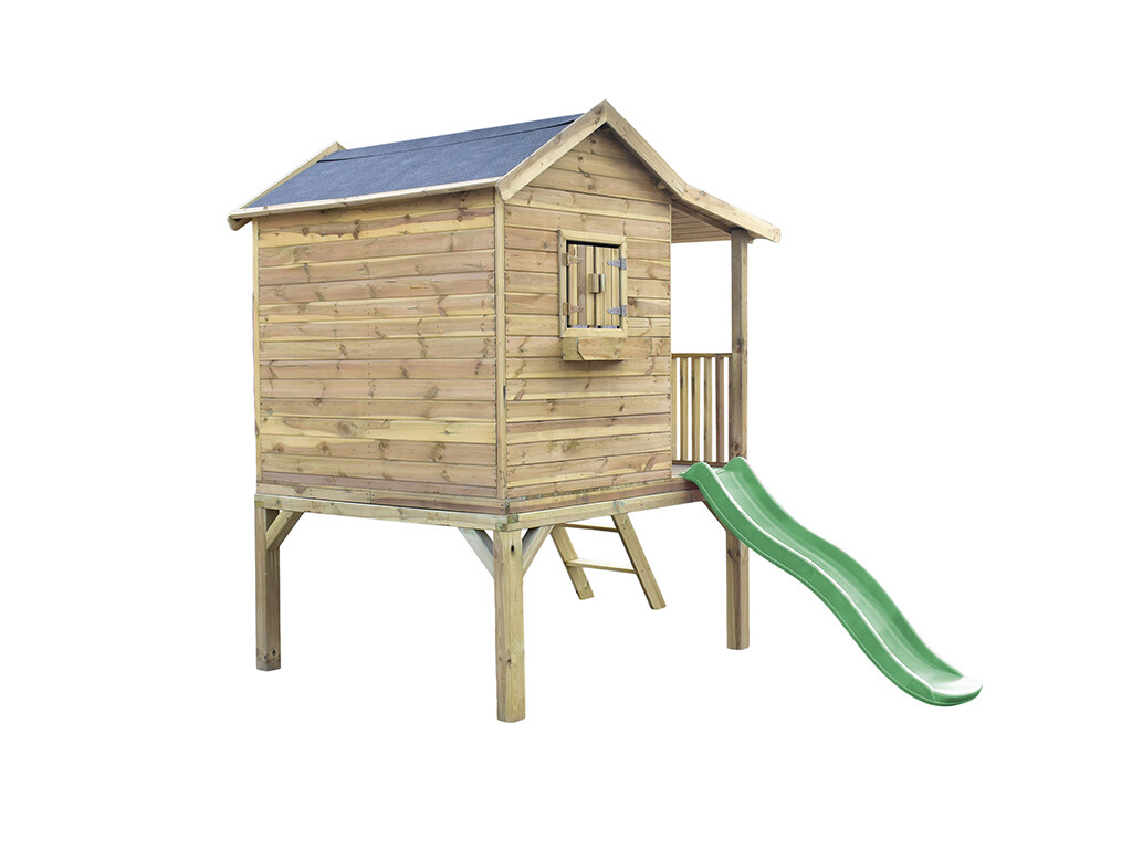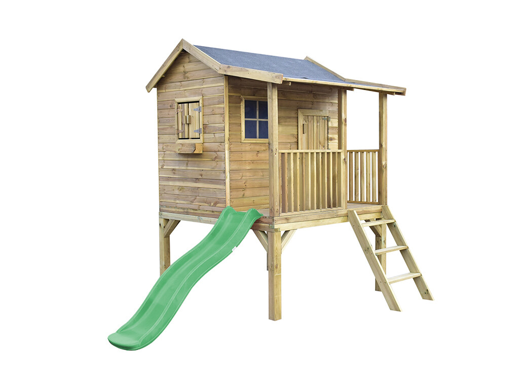 Dit speelhuis met zijn tweedelige deur biedt uw kinderen unieke ervaringen binnen hun eigen vier muren. Het huiselijke karakter wordt gecompleteerd door de veranda, de luiken en de bloembakken.