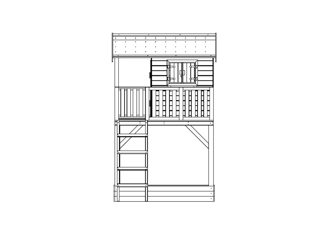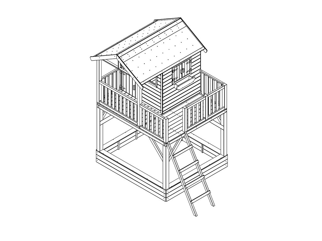 Speelhuis funny XXLis voorzien van een overdekte veranda en een groot balkon en is te bereiken via een houten ladder. Het ruime speelhuis biedt binnen voldoende ruimte voor bijvoorbeeld een kinderkeuken of een tafel.