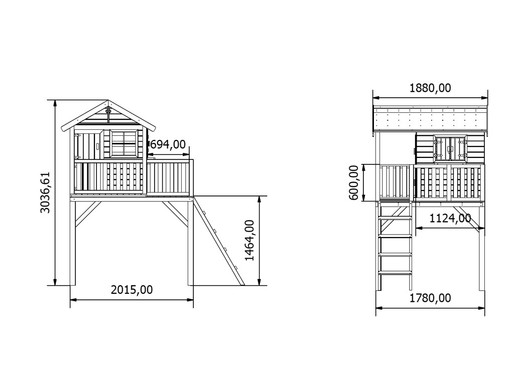 Speelhuis funny XXLis voorzien van een overdekte veranda en een groot balkon en is te bereiken via een houten ladder. Het ruime speelhuis biedt binnen voldoende ruimte voor bijvoorbeeld een kinderkeuken of een tafel.