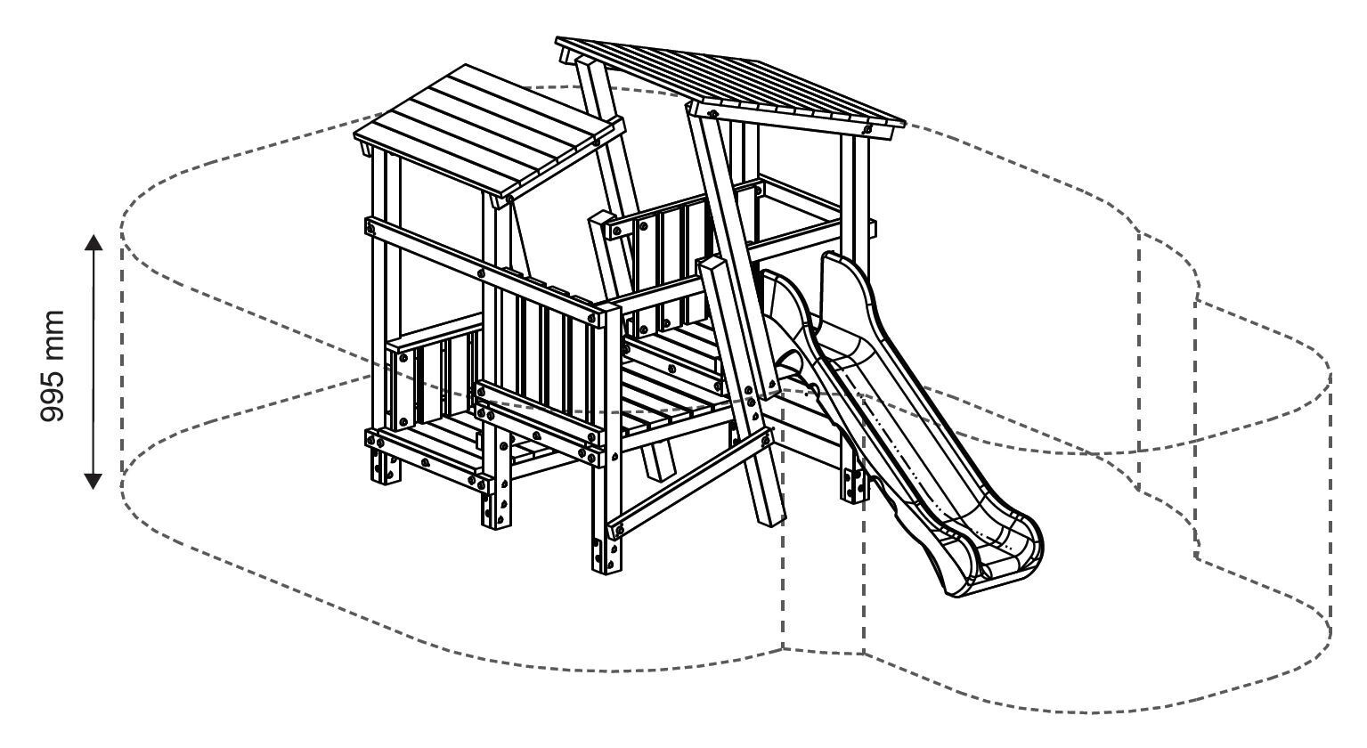 Het S-Line houtpakket bestaat uit palen (120x120mm), balken (70x45mm), planken (27x145mm).Valhoogte van dit toestel is 99,5cm. Als ondergrond adviseren wij gras, aarde, zand, snippers of schors. Op harde ondergrond adviseren wij rubbertegels van 45mm dik.
